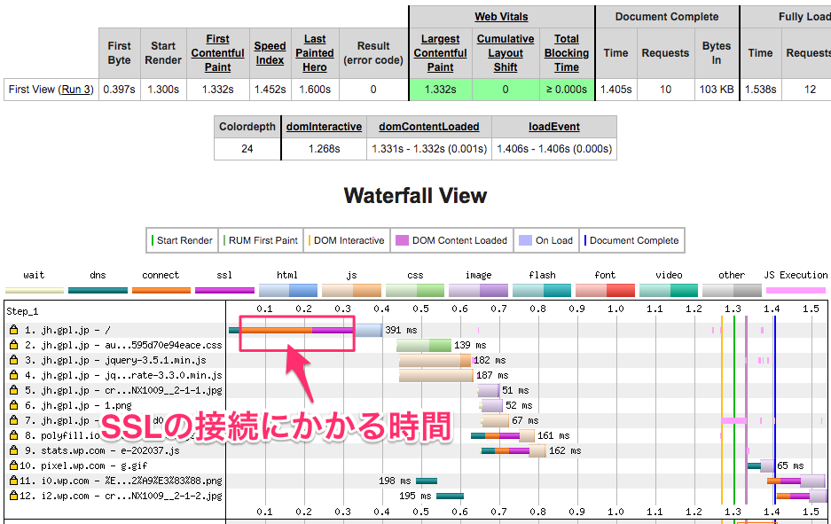 まず心配だったのは、SSLアクセスしたときのレスポンスですが、まぁ我慢どころといった感じでしょうか。
